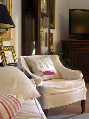 Her home is so beautiful! Love that fabric on her chair and the fish in the bathroom.