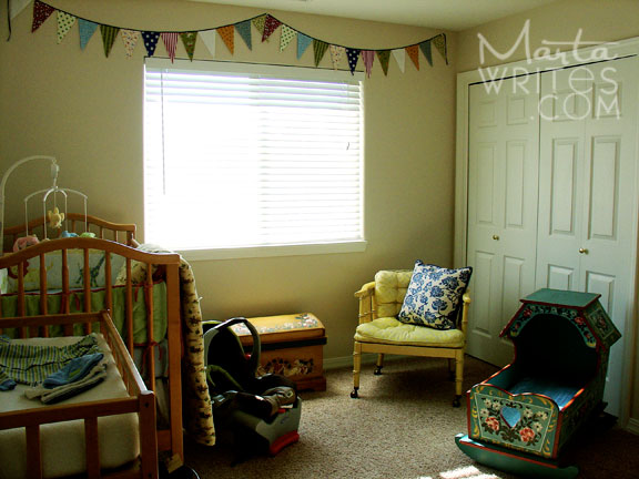i enjoy this corner of the house because it is decorated with love. it is not perfect by any means but everything in it has meaning to me. these images were taken a few days before benjamin was born. (the stuffed animals have been well loved and are no longer perfectly propped!) at the time i was nine months, big and round. i would go in there and sit awhile, feeling him kick. i wondered what it would be like to become a mom. i wondered how life would change after he arrived. i could hardly wait to meet him, even setting out outfits with anticipation. after moving to our new home in idaho we had little to spend on new decorations for the baby room. i tried to make the most of it and decided to utilize favorite hand-me-downs. the antique yellow chair was inherited from my grandma, the handpainted cradle (now holding baby quilts) was the same one i slept in as a baby, the bedding and mobile came from my sisters, the furniture is from my sister-in-law and the van gogh print, First Steps, has been a favorite of mine forever. the blue and white striped totes on his changing table (and under his crib) hold diapers, blankets, jammies and clothes. they may have been my best baby purchase yet, i’ll find tons of uses for them throughout his life. a darling friend created the hanging pennant bunting that incorporated a circus of happy colors in vintage materials to assist in pulling the nursery together. i love that the pennant feels like a little party. however–after benji was born–i learned a valuable lesson. what i didn’t realize back then was that the fancy furniture, hip wallpaper and newest crib bedding doesn’t really matter. it’s not about what is in your home, it’s about who is in your home. when i focus on the many blessings we have, i am not so worried about the latest and greatest in trendy decorations. the home is where the heart is and all the people that i love helped add to his nursery.