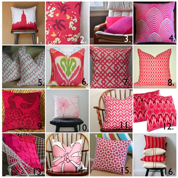 Pink is one of my very favorite colors and it just so happens to be perfect for Valentine’s Day. Here are some of my favorite pink pillow finds. Enjoy! 1. 2. 3. 4. 5. 6. 7. 8. 9. 10. 11. 12. 13. 14. 15. 16.