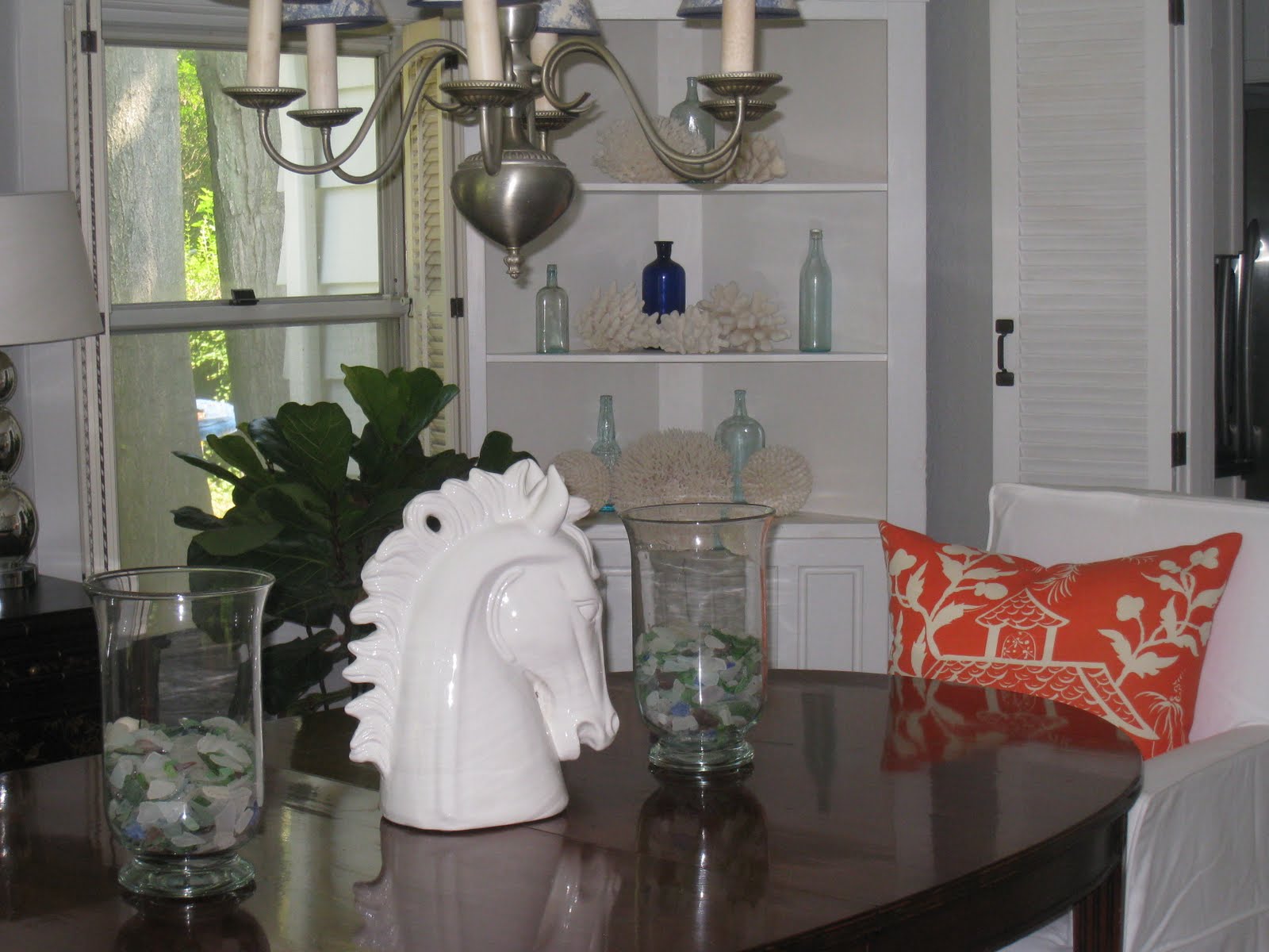 I love the pillows, but I LOVE that horse head. What an unconventional dining table piece!