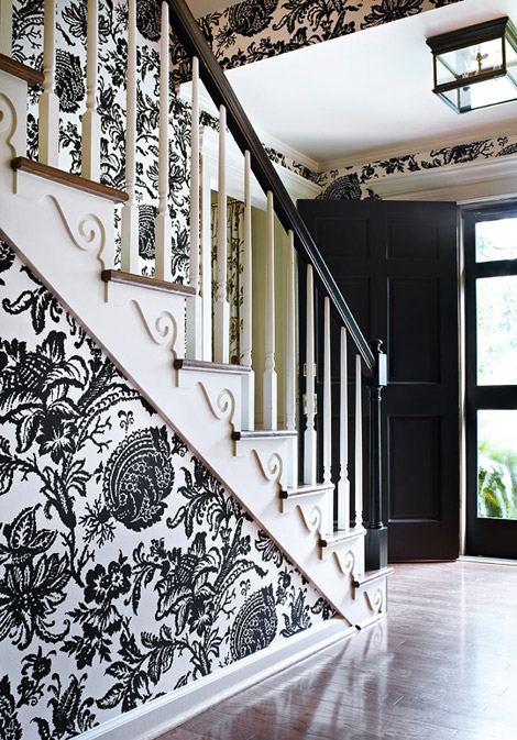 The wallpaper in the foyer is gorgeous. But I am in love with that chest of drawers, painted black with white drawers, up against the wallpaper