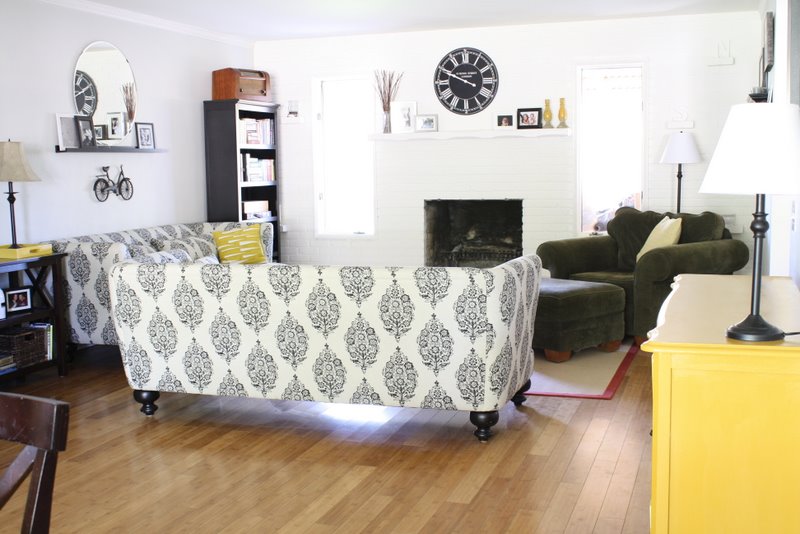 what a comfy home! I love the pops of yellow everywhere and the fabric on the sofas. 🙂