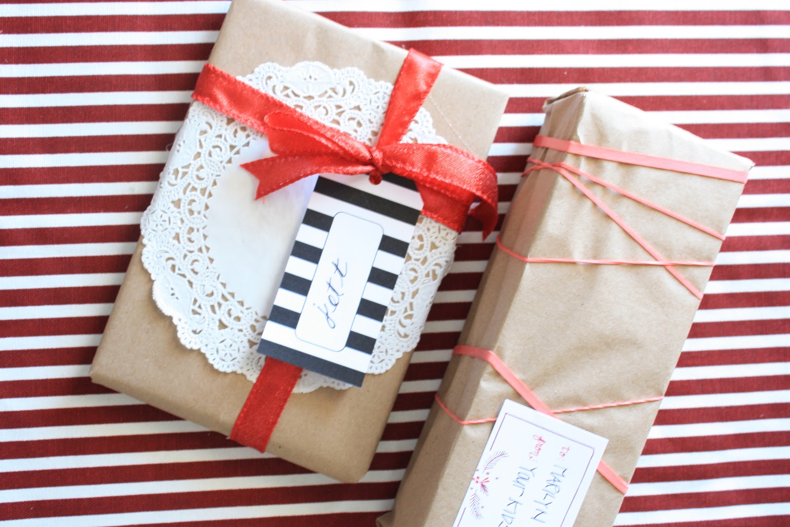 For this polka dot wrapping I simply used some red dot stickers from my local office supply store. The ones I bought are similar to these. I downloaded some free black and white gift tags from Jones Design Company.