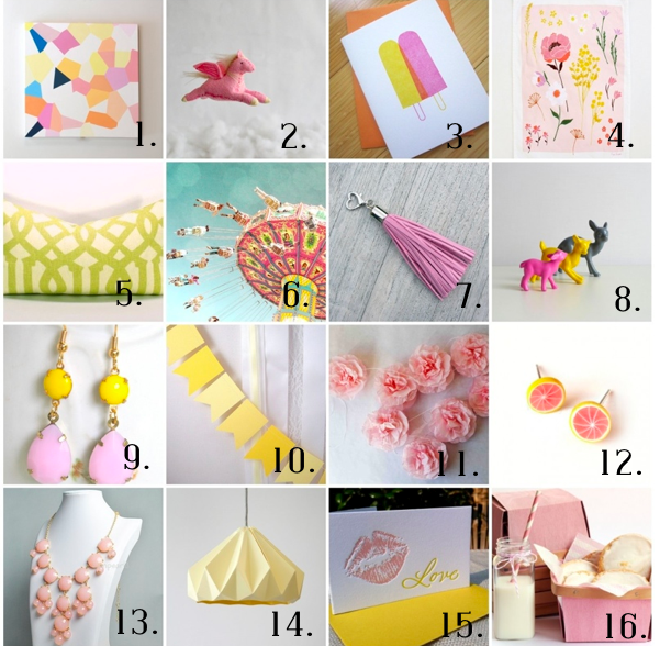 Today my Etsy roundup is inspired by two of the colors I am putting in the nursery, yellow and pink! I love these happy colors together. 1. 2. 3. 4. 5. 6. 7. 8. 9. 10. 11. 12. 13. 14. 15. 16.