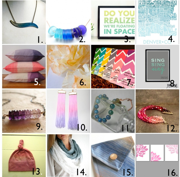 I’m becoming obsessed with all things ombre. Here are my favorites found on etsy. 1. 2. 3. 4. 5. 6. 7. 8. 9. 10. 11. 12. 13. 14. 15. 16.