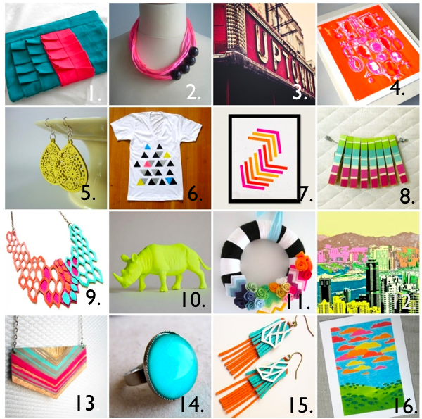 Neon is quickly becoming the newest design trend. I’m not sure yet if I’m ready to fully embrace it. But Etsy is giving me a little bit of inspiration. 1. 2. 3. 4. 5. 6. 7. 8. 9. 10. 11. 12. 13. 14. 15. 16.