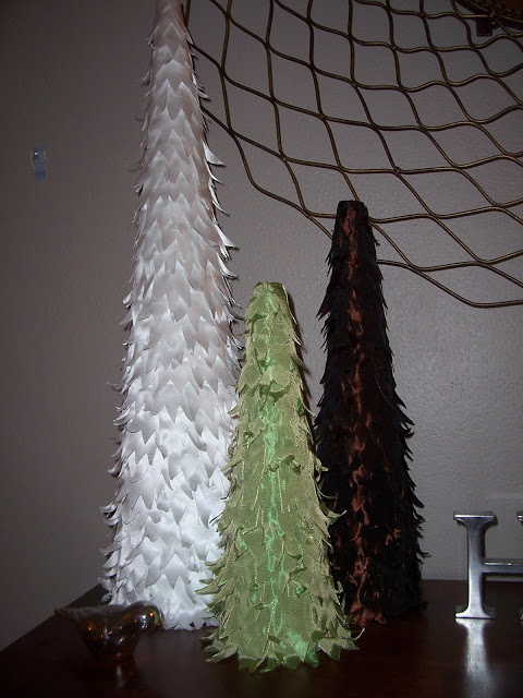 I love this idea from one of my favorite blogs. Joi made these beautiful trees using styrafoam forms and ribbon. They look great and think of all the colors you could do!